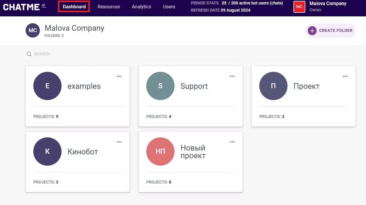 Вкладка Dashboard (Страница Папок)