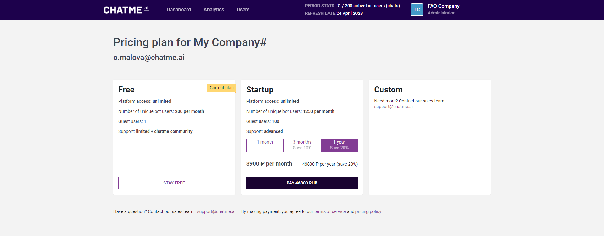 Страница тарифов и биллинга располагается по адресу Биллинг.Переход на страницу тарифов и биллинга возможен из Панель настроек аккаунта и компании по нажатию кнопки-ссылки Switch or upgrade your plan на вкладке Billing. На странице содержатся данные, относящиеся к текущему пользователю. Подробнее: Подписка и оплата.