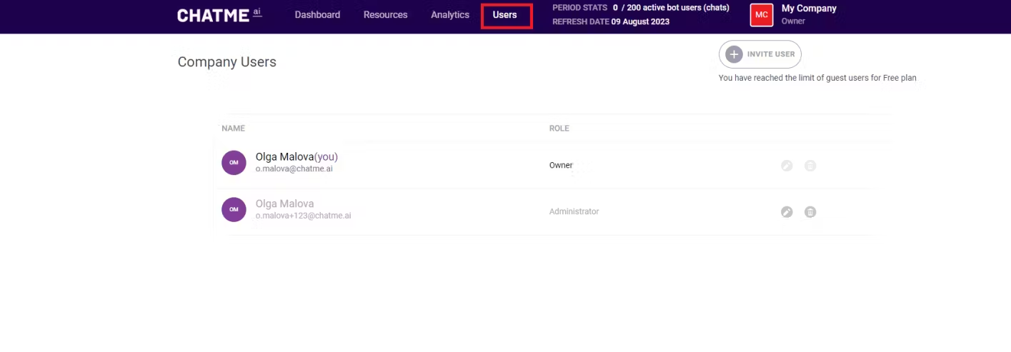 Users — вкладка, на которой можно редактировать список пользователей текущей Компания и приглашать новых, если у пользователя есть соответствующие права.Вкладка располагается по адресу Вкладка Пользователей.Подробнее об управлении пользователями Компания: Роли пользователей и управление пользователями Компании.