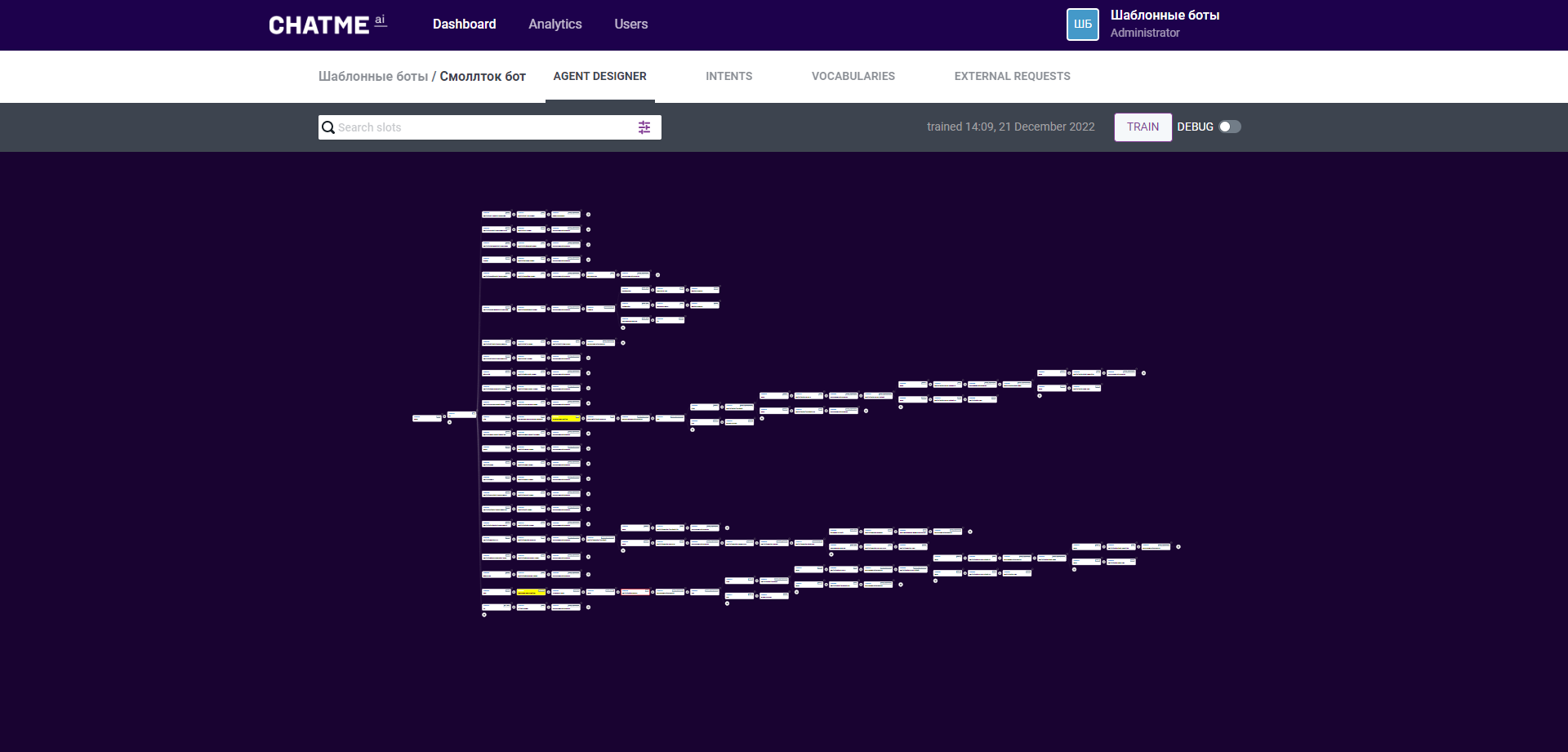 БотБилдер — инструмент для построения Сценарий агента. Позволяет создавать Агентов с помощью графического интерфейса. Включает в себя вкладки Agent Designer, Intents, Vocabularies, External request. Подробнее: Обзор конструктора сценария Агента и вкладок.