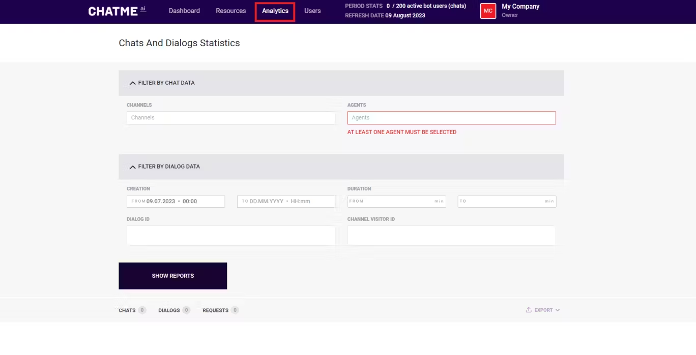 Analytics — вкладка, на которой можно просматривать и выгружать данные аналитики Общение Агентов текущей Компания.Вкладка располагается по адресу Вкладка Аналитики.Подробнее о возможностях аналитики: Вкладка Аналитики и фильтры.